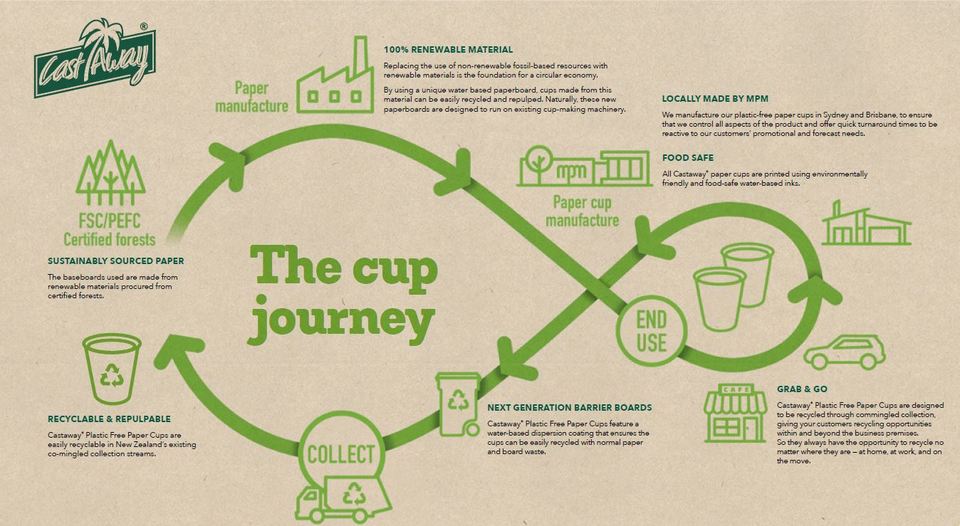 The existing recycling processes used to recycle paper in New Zealand’s infrastructure can be reused to recycle Castaway® plastic free coffee cups — no matter where they